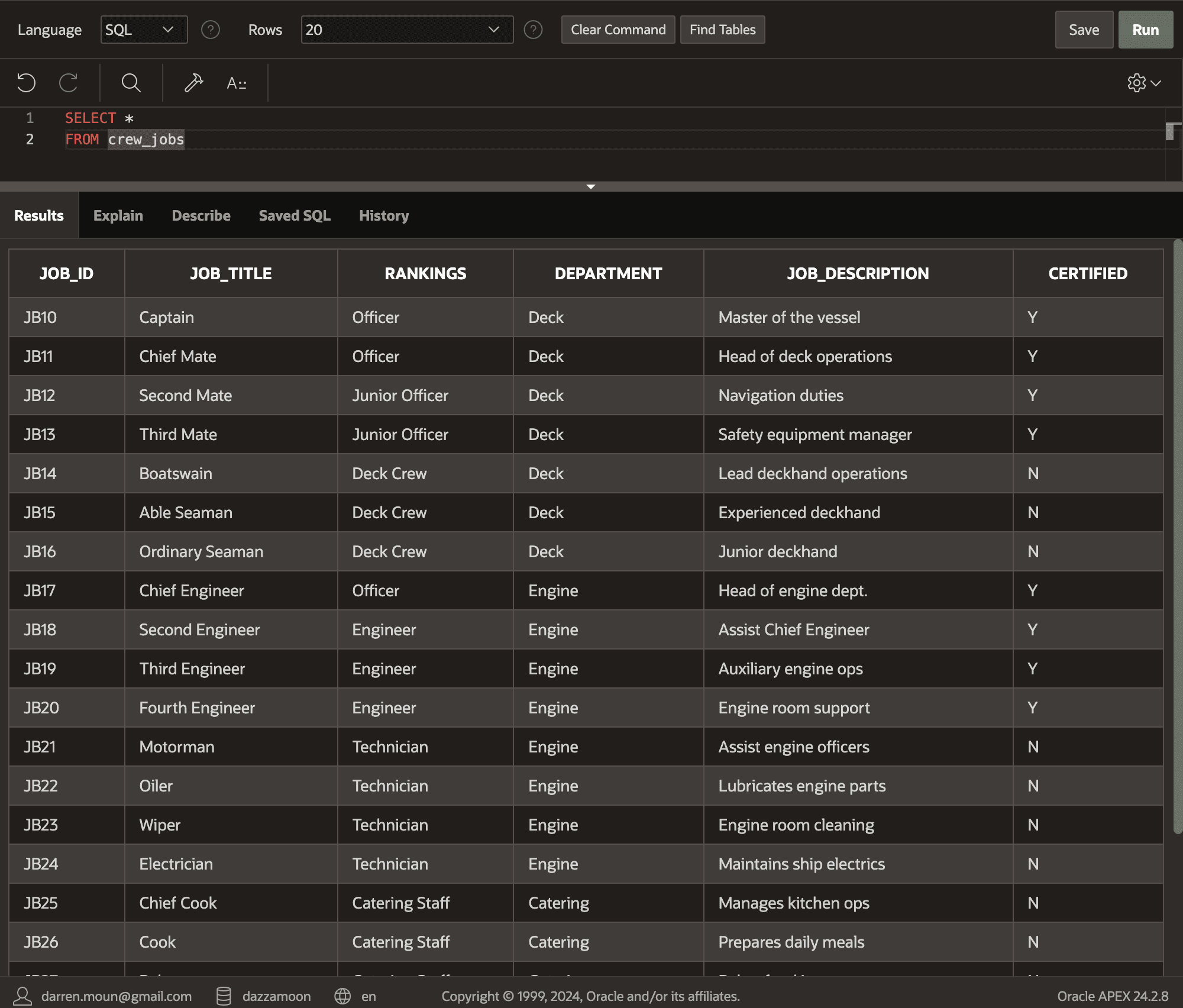 INTO crew_jobs (job_id, job_title, rankings, department, job_description, certified)